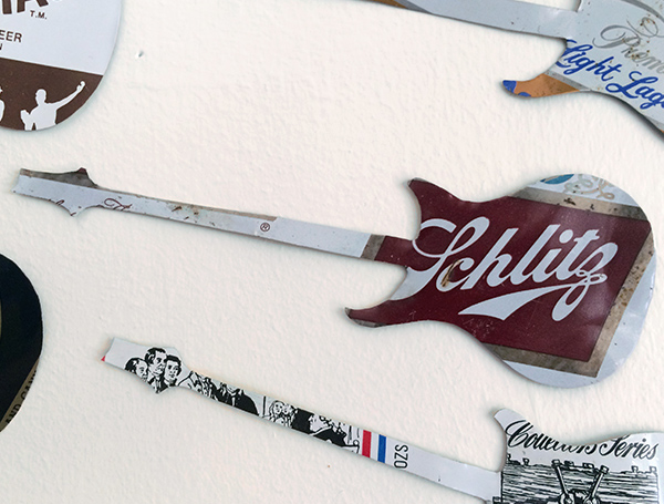 We created this sculpture from old beer cans cut into the shape of Paul Reed Smith guitars and installed on client's wall