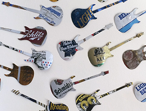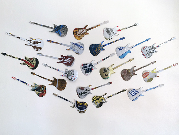 We created this sculpture from old beer cans cut into the shape of Paul Reed Smith guitars and installed on client's wall